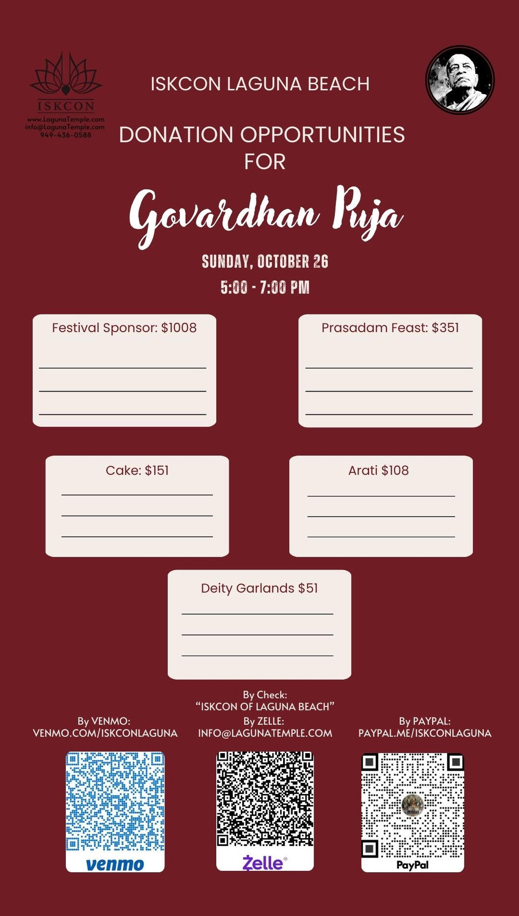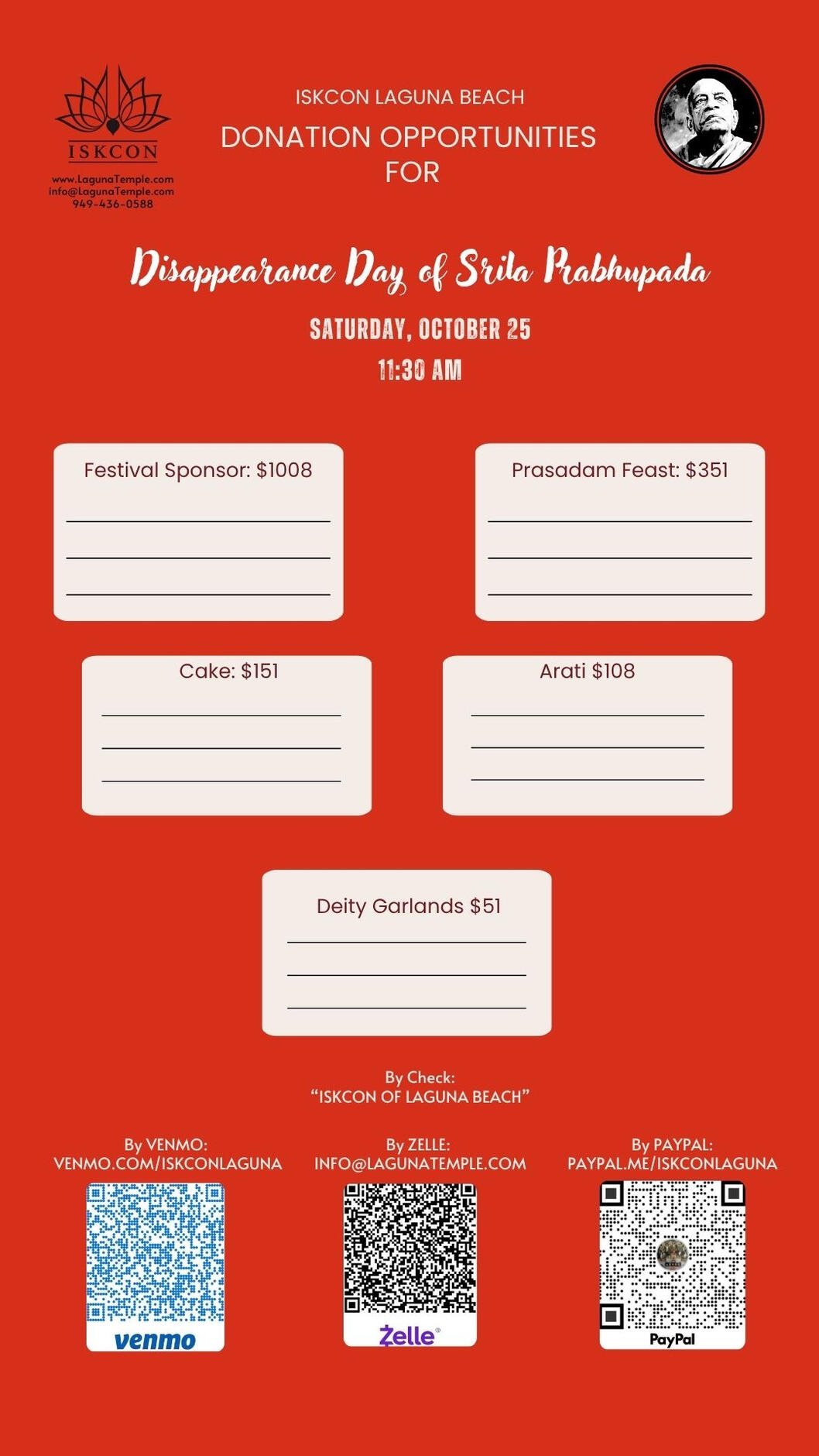 Donations can be made via:- Zelle to info@lagunatemple.com- PayPal at PayPal.me/ISKCONlaguna- Venmo to ISKCONlaguna, or to www.venmo.com/ISKCONlaguna- Check made out to ISKCON of Laguna Beach and mailed to: