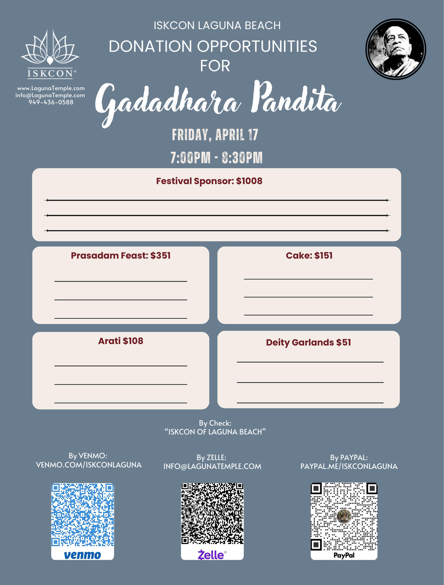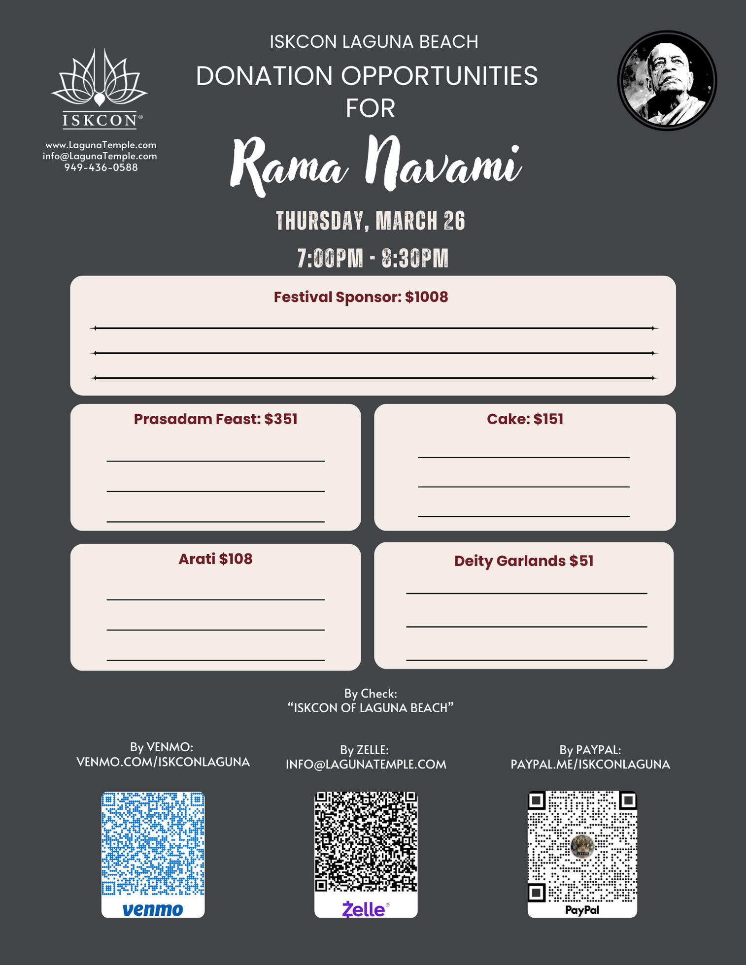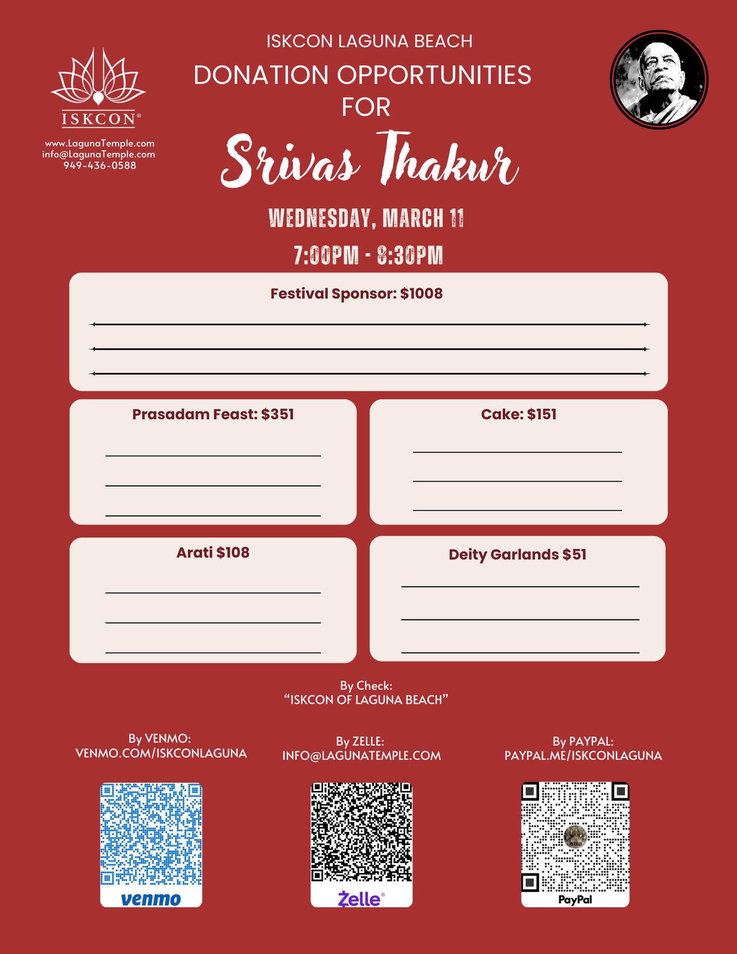 Donations can be made via:- Zelle to info@lagunatemple.com- PayPal at PayPal.me/ISKCONlaguna- Venmo to ISKCONlaguna, or to www.venmo.com/ISKCONlaguna- Check made out to ISKCON of Laguna Beach and mailed to: