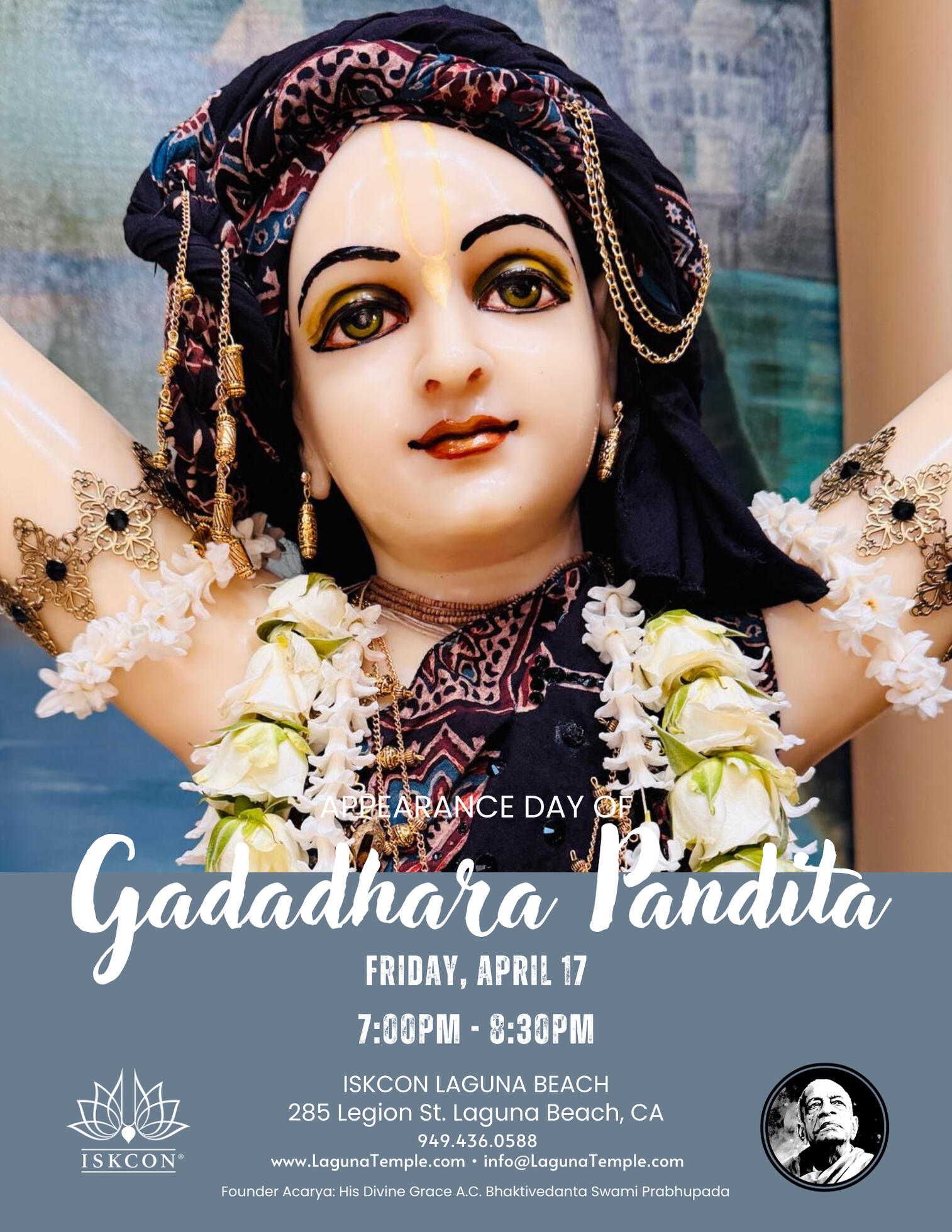 - Appearance of Gadadhara Pandit - Friday April 17, 7p-8:30p
