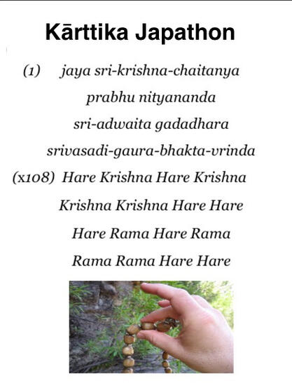 Kārttika JapathonThe holy month of Kārttika starts on Monday, Oct 6th.Our goal is to please Krishna by collectively chanting 110 million names of Krishna during the month of Kārttika.Will you please join us?One maha-mantra contains 16 names of Krishna: